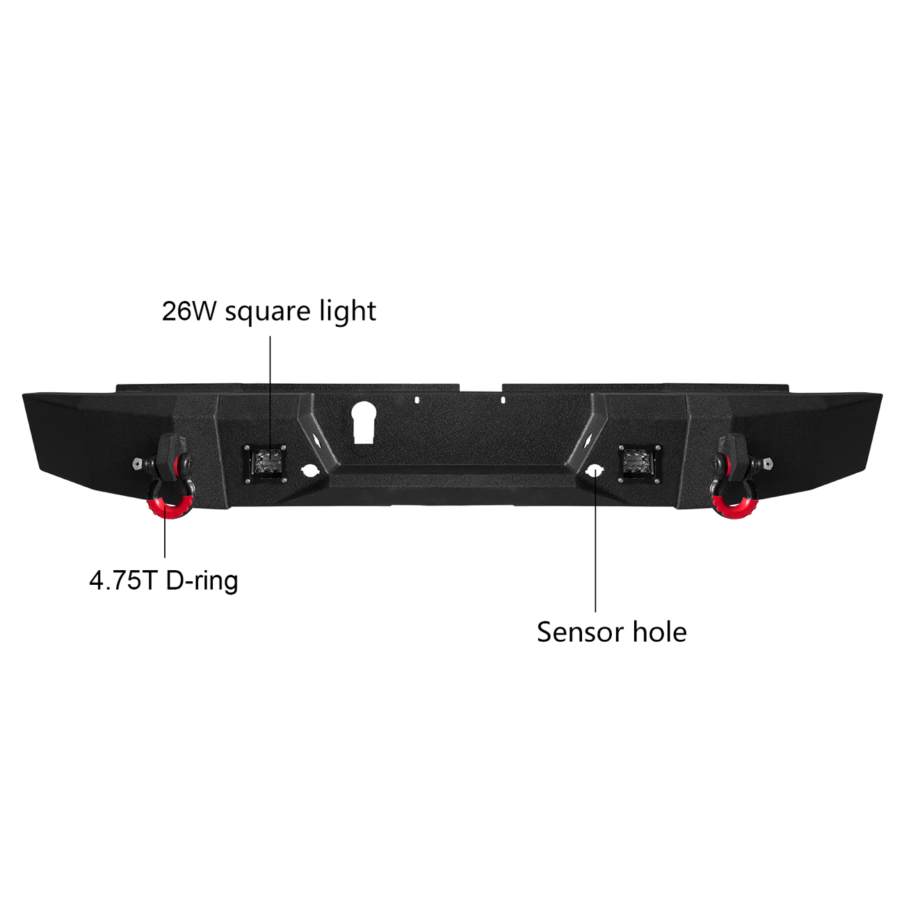 [Heavy Duty Construction]: The bumper body is made of heavy-duty, high-strength 7/64-inch steel, and the mounting brackets are made of 3/16-inch steel. The rear bumper weighs approximately 87 lbs