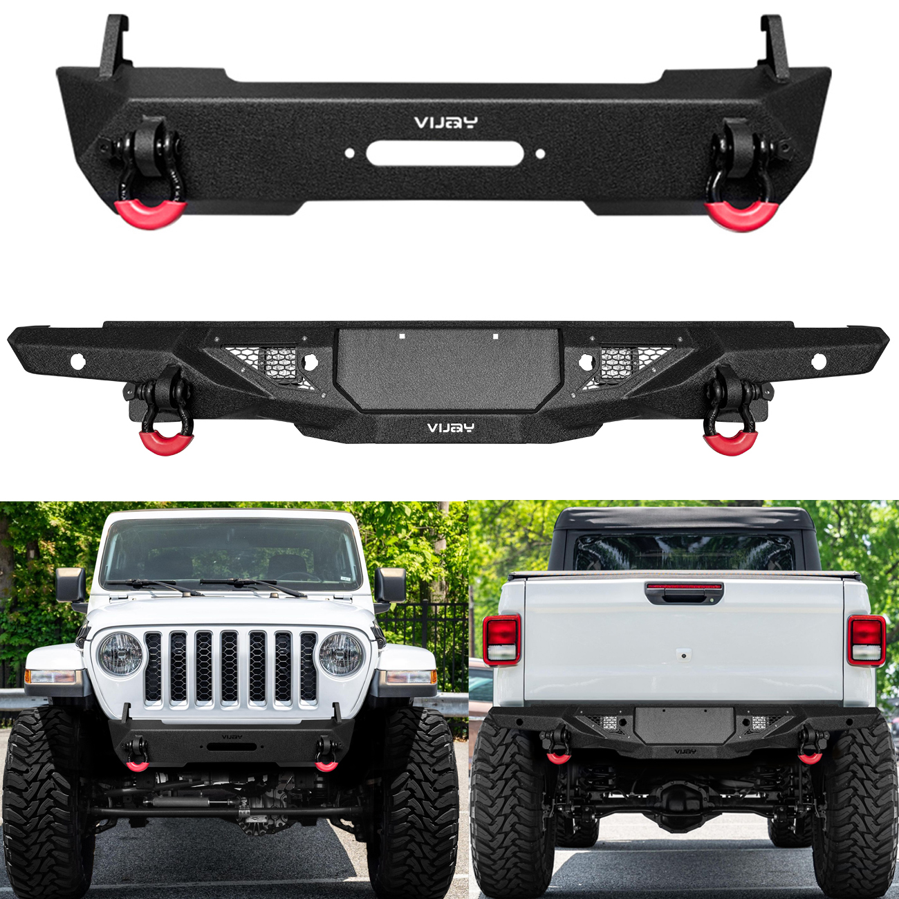 [Heavy Duty Construction]: The bumper body is made of heavy-duty, high-strength 9/64-inch steel, and the winch plate and mounting brackets are made of 3/16-inch steel. The front bumper weighs approximately 59 lbs and the rear bumper weighs approximately 52 lbs, both packages are shipped separately
