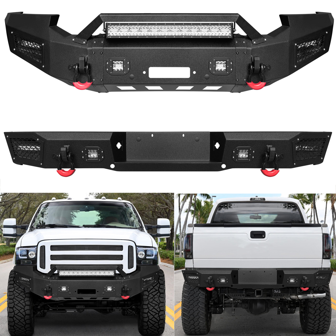 [Heavy Duty Construction]: The bumper body is made of heavy-duty, high-strength 7/64-inch steel, and the winch plate and mounting brackets are made of 3/16-inch steel. The front bumper weighs approximately 141 lbs and the rear bumper weighs approximately 77 lbs, both packages are shipped separately