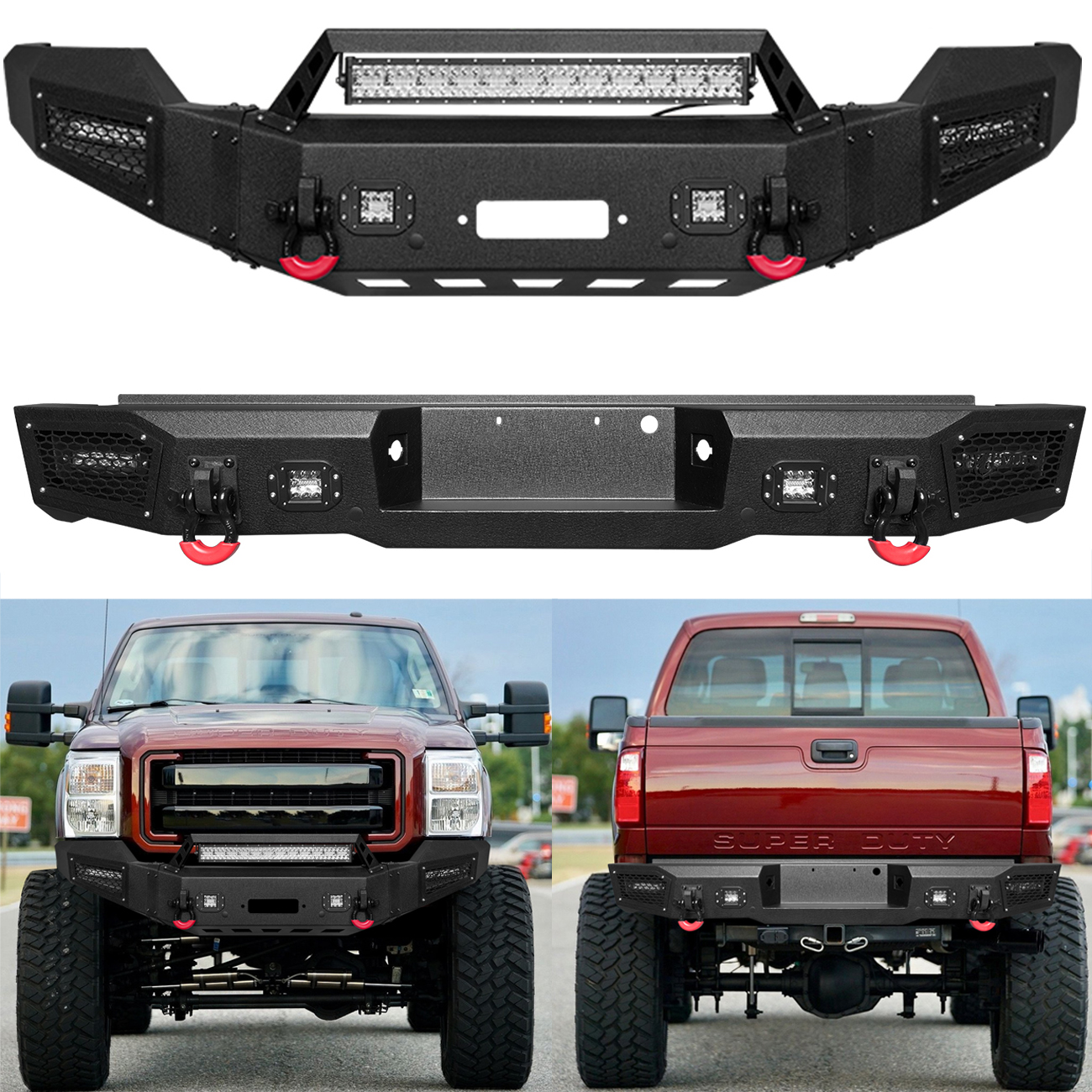 [Heavy Duty Construction]: The bumper body is made of heavy-duty, high-strength 7/64-inch steel, and the winch plate and mounting brackets are made of 3/16-inch steel. The front bumper weighs approximately 146 lbs and the rear bumper weighs approximately 87 lbs, both packages are shipped separately