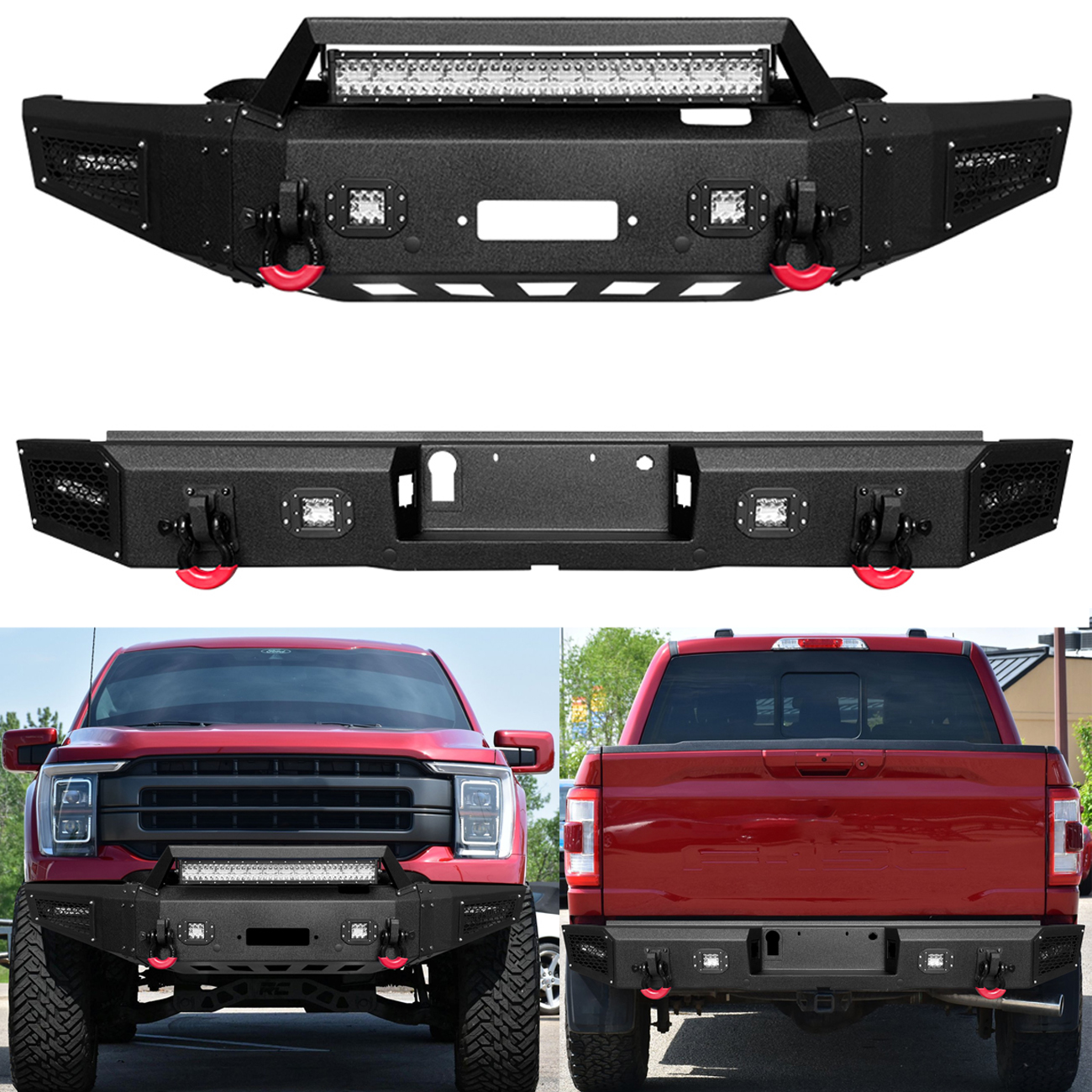 [Heavy Duty Construction]: The bumper body is made of heavy-duty, high-strength 7/64-inch steel, and the winch plate and mounting brackets are made of 3/16-inch steel. The front bumper weighs approximately 134 lbs and the rear bumper weighs approximately 74 lbs, both packages are shipped separately
