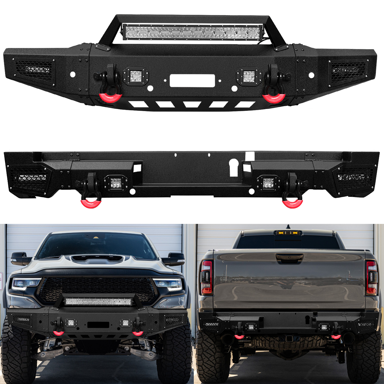 [Heavy Duty Construction]: The bumper body is made of heavy-duty, high-strength 7/64-inch steel, and the winch plate and mounting brackets are made of 3/16-inch steel. The front bumper weighs approximately 143 lbs and the rear bumper weighs approximately 96 lbs, both packages are shipped separately