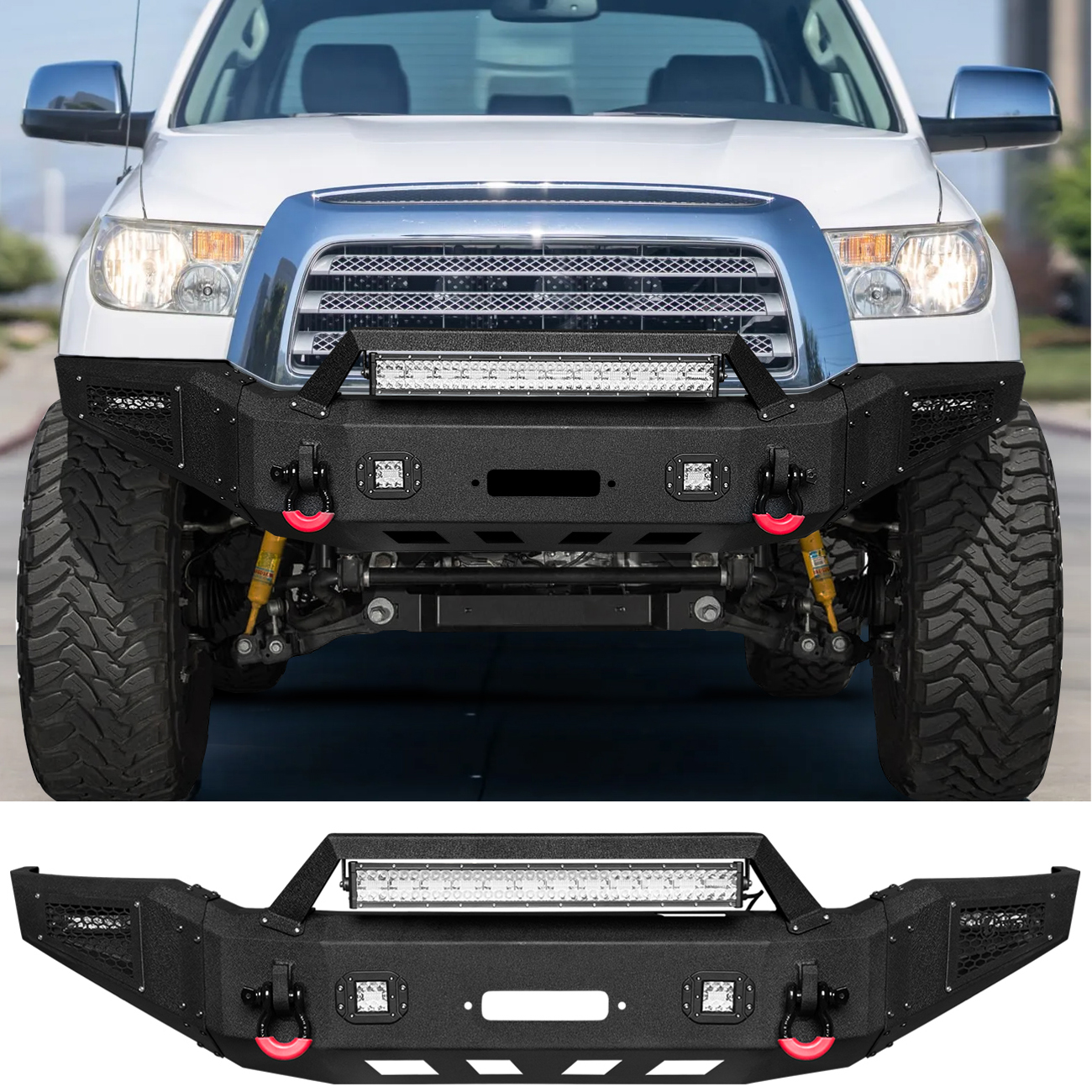 [Comprehensive Protection]: The three-piece structure front bumper perfectly fits the body lines. Rugged off-road styling enhances the vehicle’s overall aesthetic, giving it a tough and aggressive look