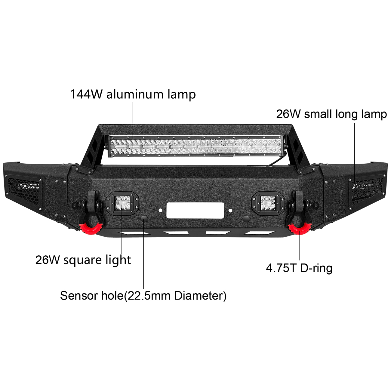 [Heavy Duty Construction]: The bumper body is made of heavy-duty, high-strength 7/64-inch steel, and the winch plate and mounting brackets are made of 3/16-inch steel. The front bumper weighs approximately 146 lbs