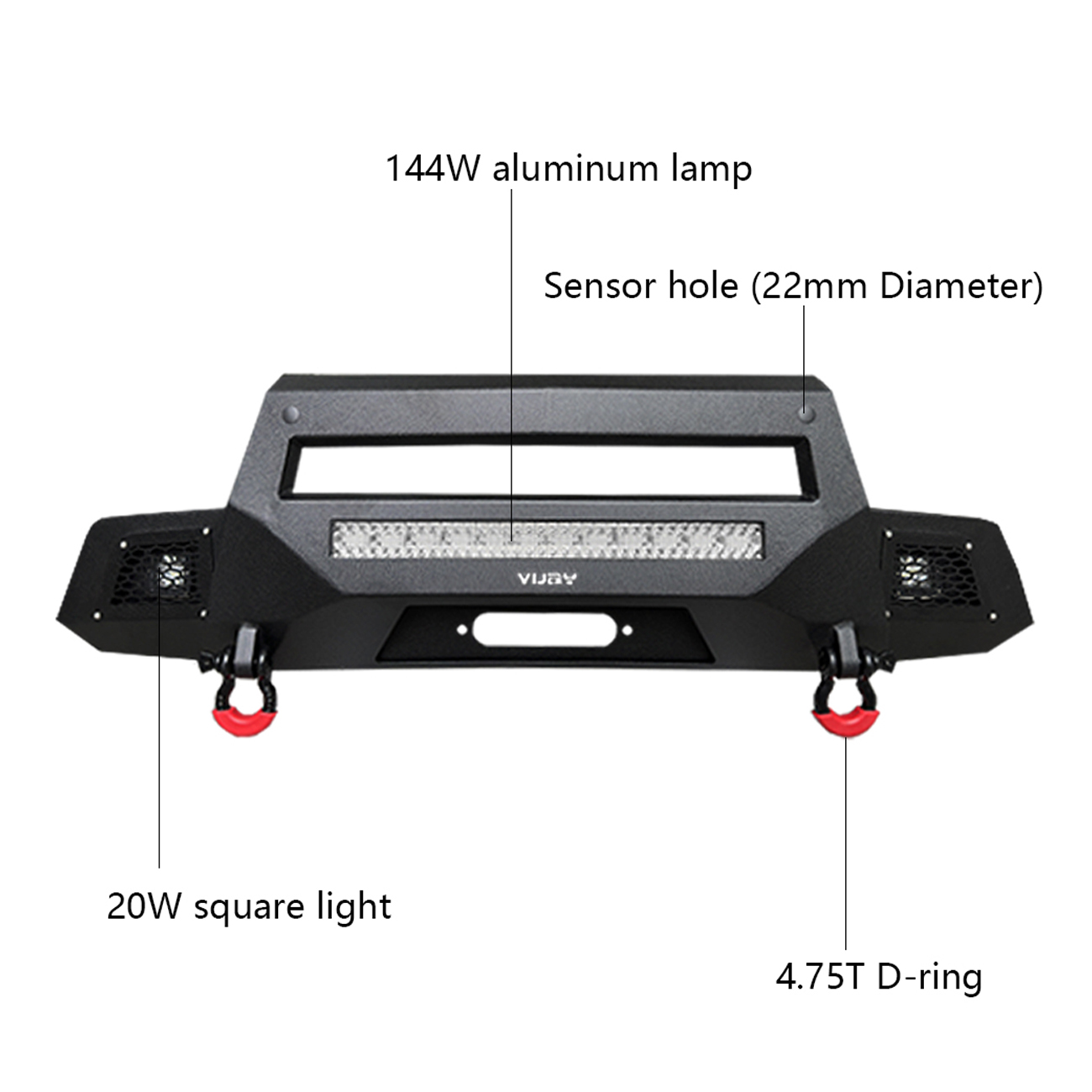 [Heavy Duty Construction]: The bumper body is made of heavy-duty, high-strength 7/64-inch steel, and the winch plate and mounting brackets are made of 3/16-inch steel. The front bumper weighs approximately 109 lbs