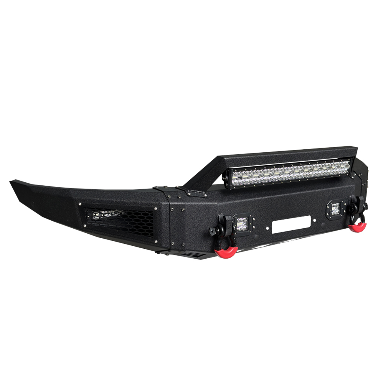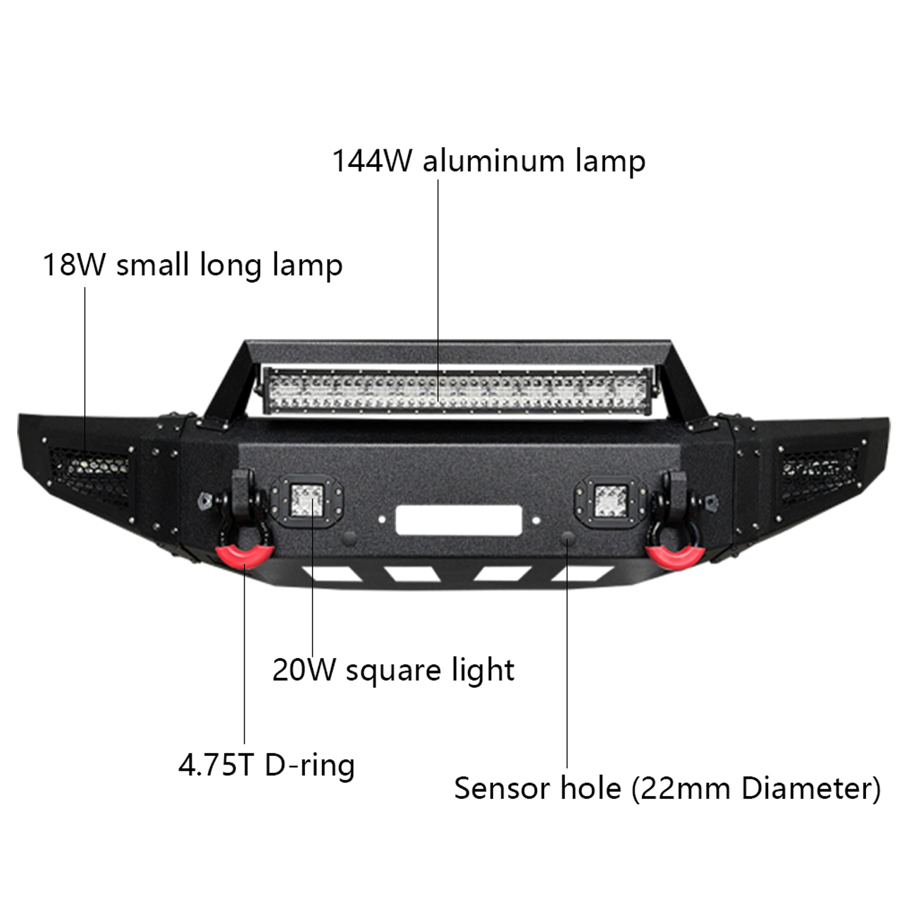 [Heavy Duty Construction]: The bumper body is made of heavy-duty, high-strength 7/64-inch steel, and the winch plate and mounting brackets are made of 3/16-inch steel. The front bumper weighs approximately 122 lbs