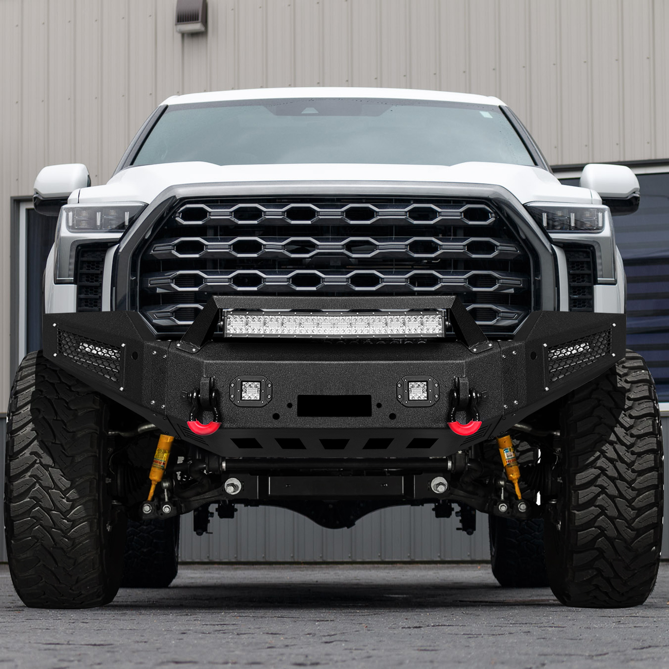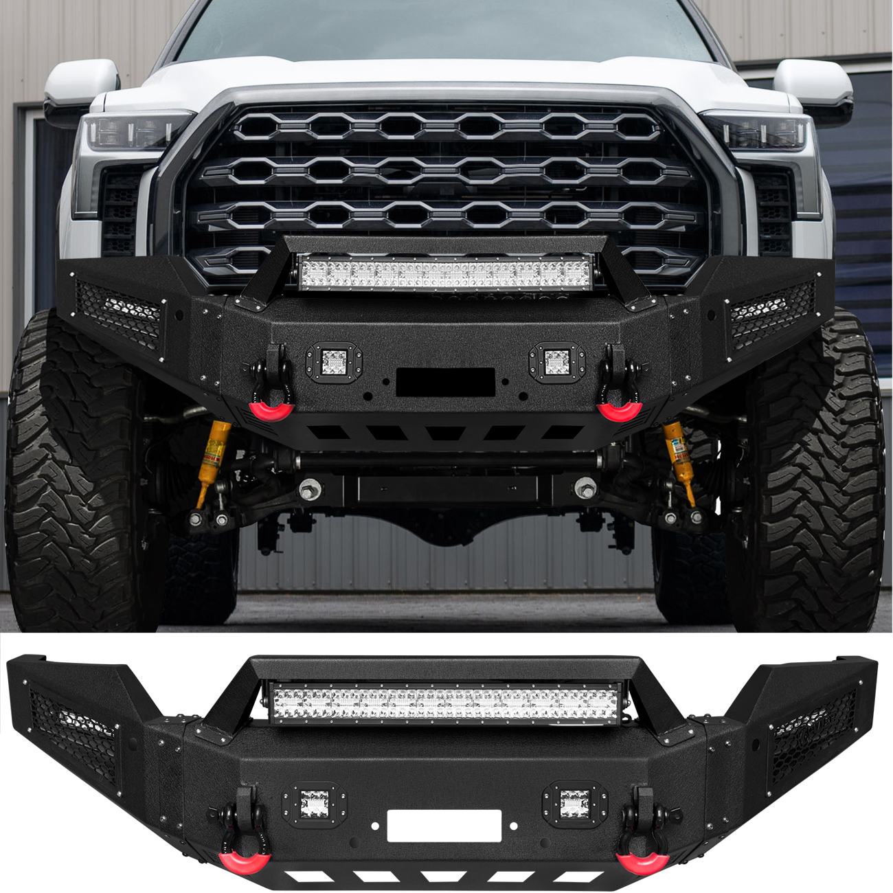 [Comprehensive Protection]: The three-piece structure front bumper perfectly fits the body lines. Rugged off-road styling enhances the vehicle’s overall aesthetic, giving it a tough and aggressive look