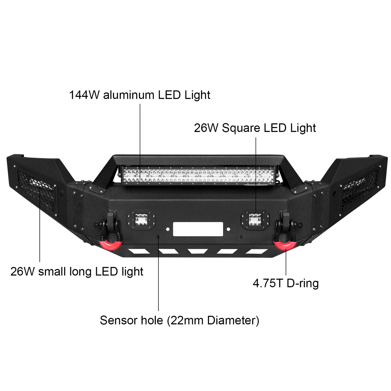 [Heavy Duty Construction]: The bumper body is made of heavy-duty, high-strength 7/64-inch steel, and the winch plate and mounting brackets are made of 3/16-inch steel. The front bumper weighs approximately 145 lbs