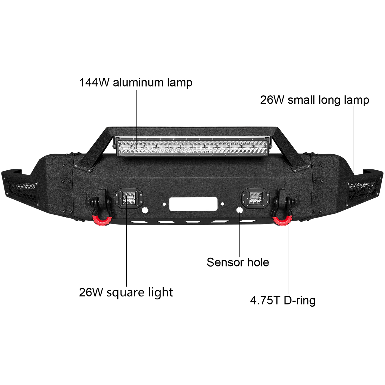 [Heavy Duty Construction]: The bumper body is made of heavy-duty, high-strength 7/64-inch steel, and the winch plate and mounting brackets are made of 3/16-inch steel. The front bumper weighs approximately 148 lbs