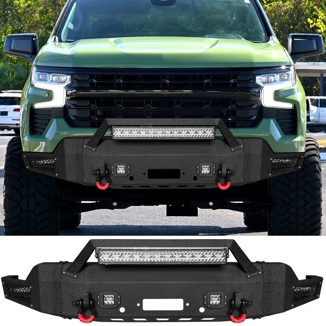 [Comprehensive Protection]: The three-piece structure bumper perfectly fits the body lines. Rugged off-road styling enhances the vehicle’s overall aesthetic, giving it a tough and aggressive look
