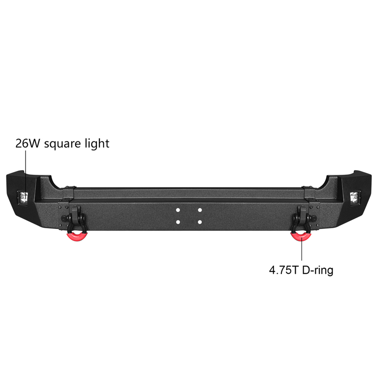 [Heavy Duty Construction]: The bumper body is made of heavy-duty, high-strength 7/64-inch steel, and the mounting brackets are made of 3/16-inch steel. The rear bumper weighs approximately 69 lbs