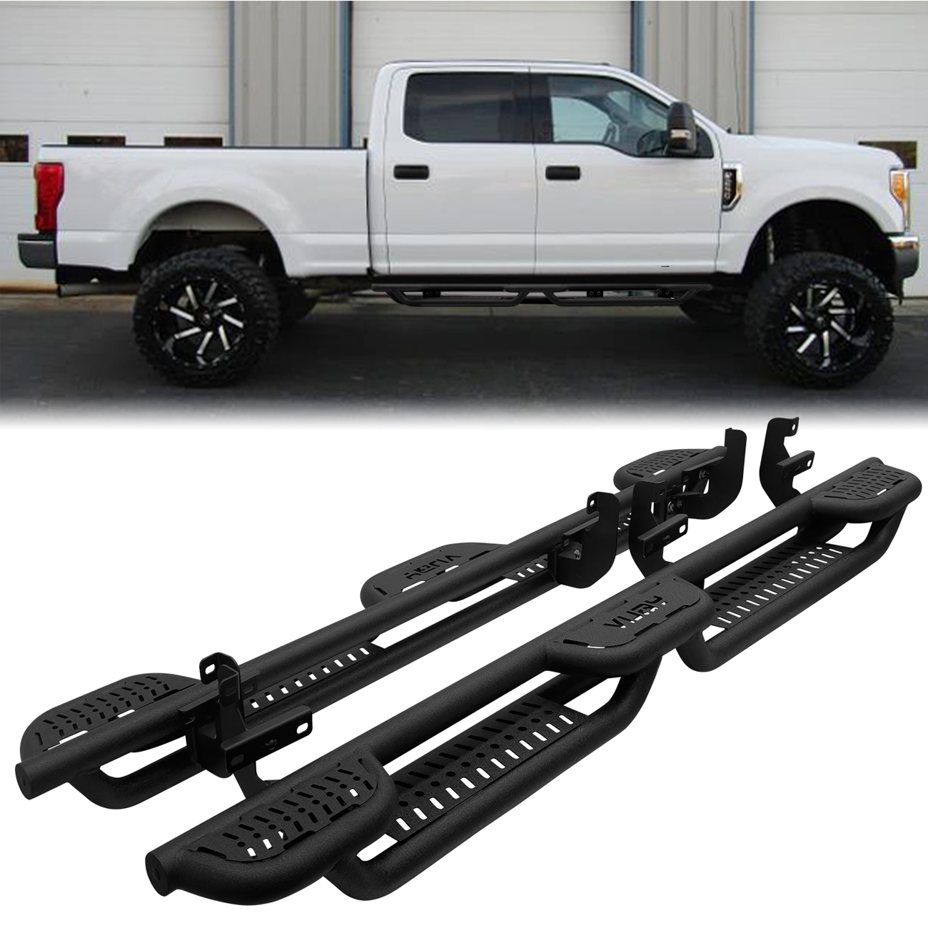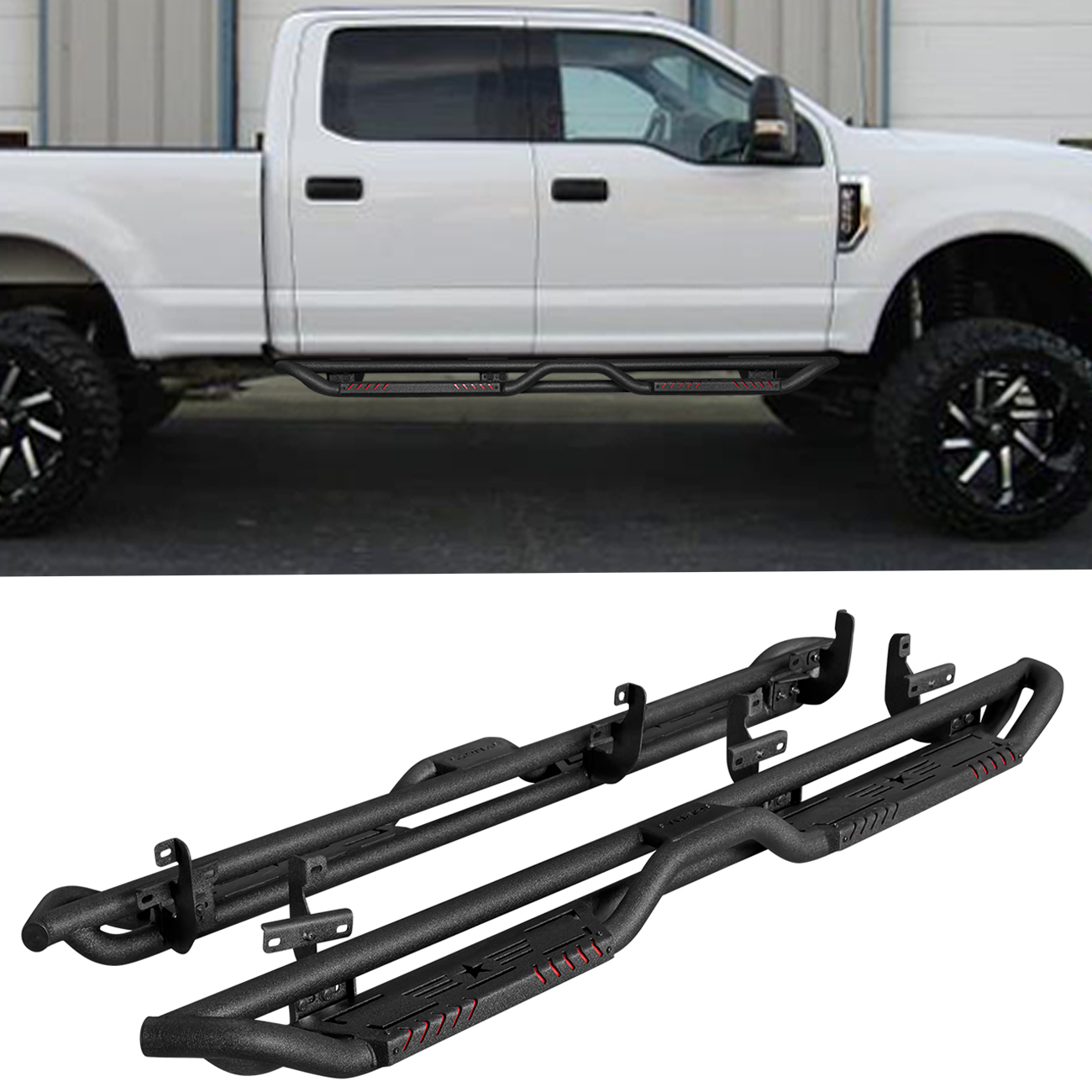 [Design Effect]: Excellent side and chassis protection. Step rails are equipped with durable non-slip step pads for easy entry and exit of your truck. Each step can support up to 350 pounds