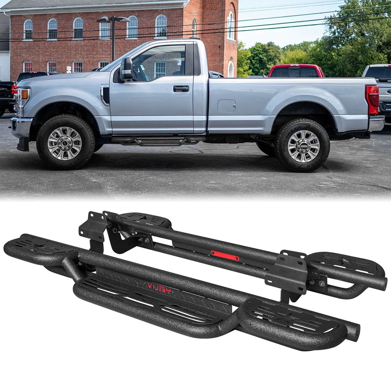[Design Effect]: Excellent side and chassis protection. Step rails are equipped with durable non-slip step pads for easy entry and exit of your truck. Each step can support up to 350 pounds