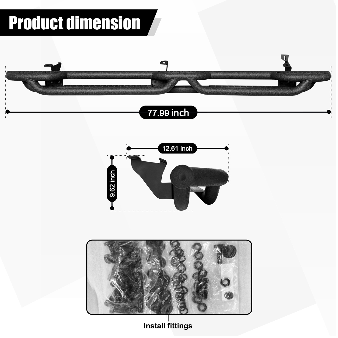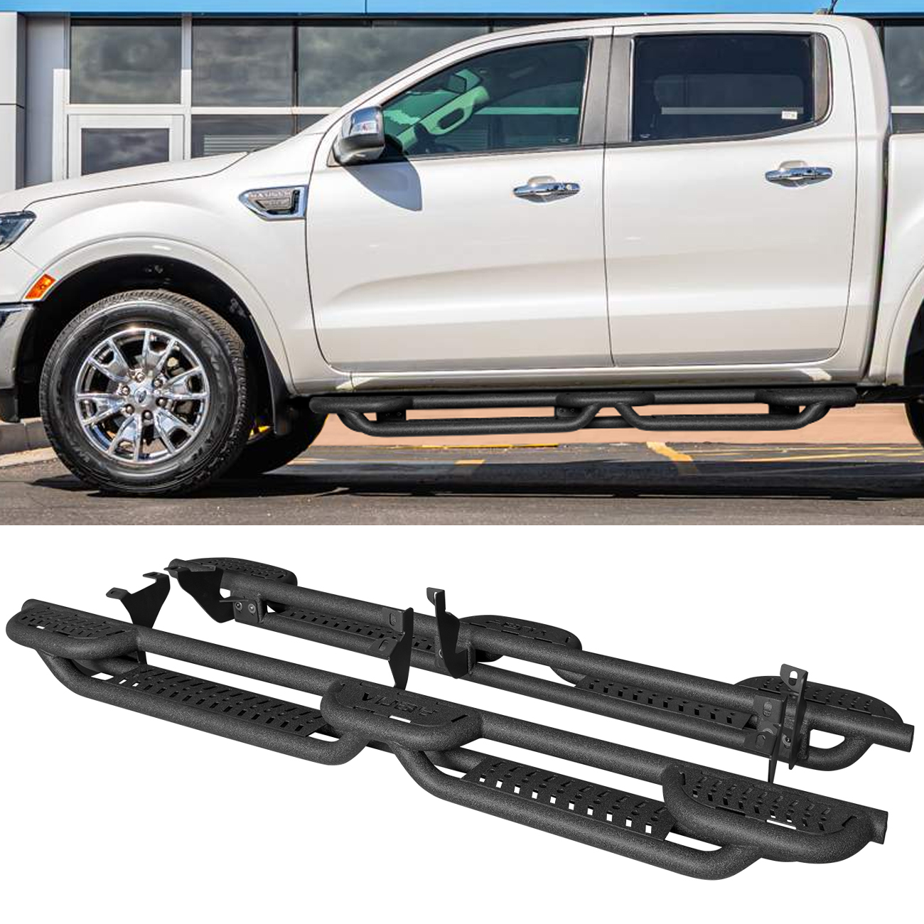 [Design Effect]: Excellent side and chassis protection. Step rails are equipped with durable non-slip step pads for easy entry and exit of your truck. Each step can support up to 350 pounds